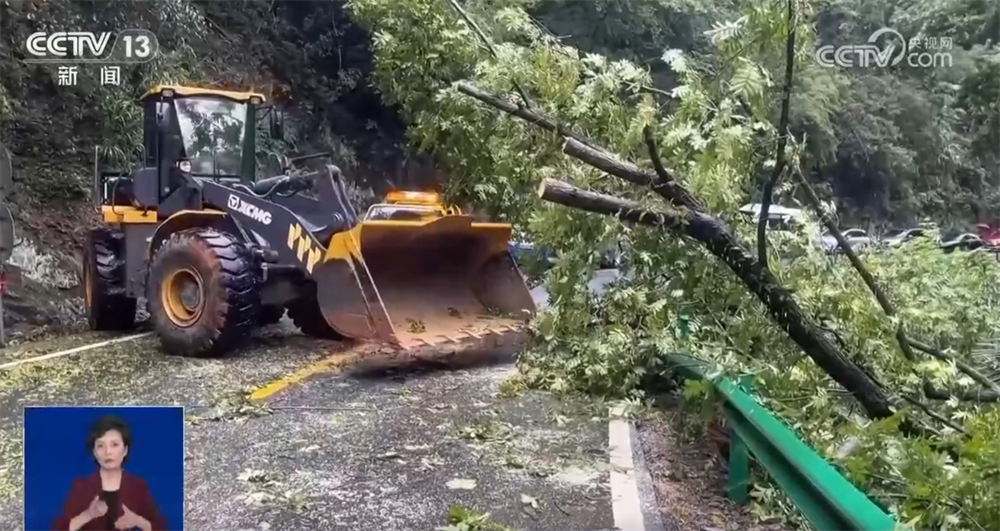 在邊坡垮塌現(xiàn)場(chǎng),大量泥石和樹(shù)木橫倒在道路中間,當(dāng)?shù)毓窊岆U(xiǎn)人員迅速對(duì)此處路段實(shí)施交通管制,并利用機(jī)械開(kāi)展清障工作。