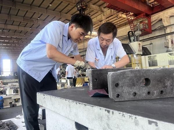 為追趕進(jìn)度,他主動(dòng)加碼訓(xùn)練:夏天的車間猶如“蒸籠”,高強(qiáng)度訓(xùn)練下,他的衣衫反復(fù)被汗水浸透,干后結(jié)出層層鹽花。他每天從清晨6點(diǎn)訓(xùn)練到晚上9點(diǎn),午間匆匆吃口飯便立刻返回實(shí)訓(xùn)場;深夜,他仍手捧理論書籍逐字鉆研,直到雙眼難睜才休息。在圖紙繪制上,別人畫一遍的圖紙,他至少畫3遍。“先憑記憶臨摹,再照著實(shí)物校準(zhǔn),用尺子反復(fù)丈量線條誤差,必須通過多次練習(xí),形成精準(zhǔn)記憶。”黨金鑫說。