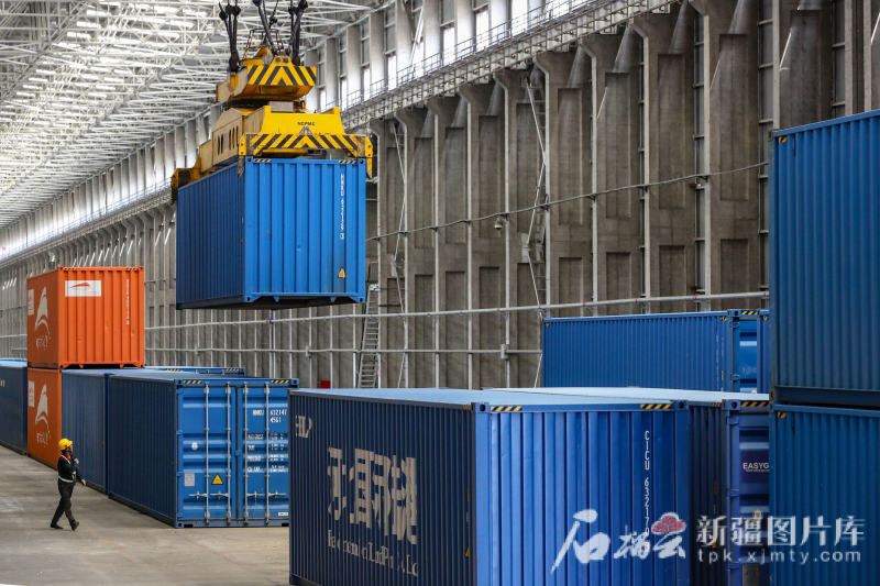 6月24日,阿拉山口站中歐(中亞)班列換裝區(qū)內(nèi)的行車在吊裝集裝箱。蔡增樂 攝