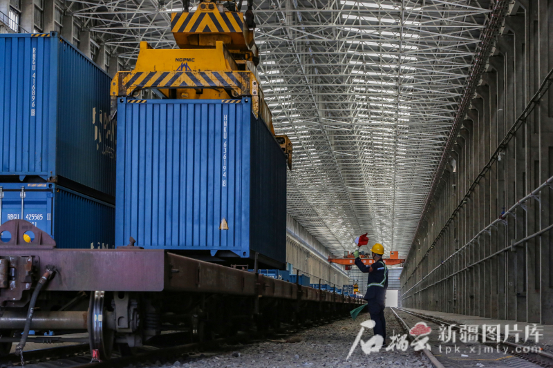 6月24日,工作人員在阿拉山口站中歐(中亞)班列換裝區(qū)指揮行車吊裝集裝箱。蔡增樂 攝