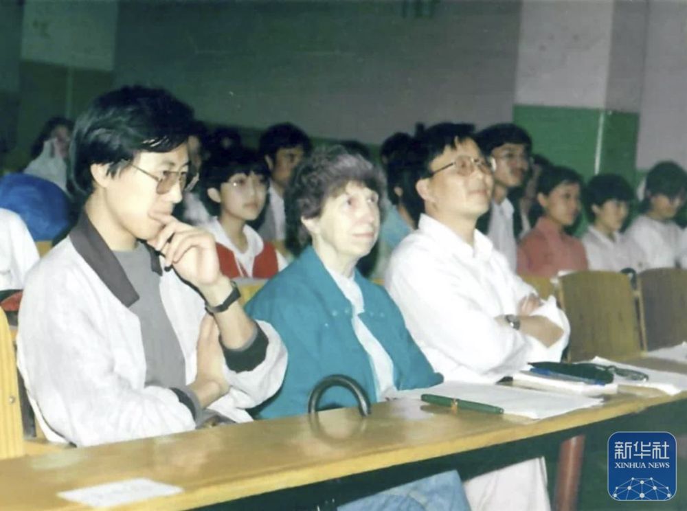 20世紀(jì)80年代,白麗詩(前中)在上海外國語大學(xué)任教時(shí)的工作照(翻拍照片)。