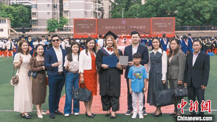 在廣西科技大學(xué)27日舉行的畢業(yè)典禮上,老撾留學(xué)生馬麗文成為全場焦點:她的父母、兄弟等十位親人跨國而來,見證這一重要時刻?!爱?dāng)家人手捧鮮花向我走來,我緊緊擁抱住他們,感謝他們支持我的夢想?!瘪R麗文說。