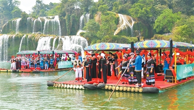水霧籠罩,銀河跌落,瀑聲隆隆。德天瀑布下的歸春河兩岸,各有一只竹排,船頭相對(duì),上面人影綽約——中越界河山歌會(huì)在此舉行。