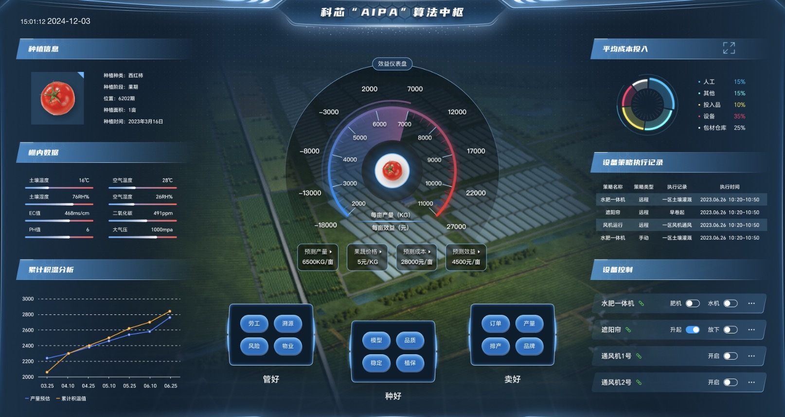科芯自主研發(fā)的AIPA系統(tǒng),整合了多項(xiàng)新興技術(shù),能夠精準(zhǔn)描述作物的生長動態(tài),并作出生產(chǎn)力預(yù)測與效益評估。胡建龍形象地比喻:“這就像是給農(nóng)作物配備了一位24小時在線的‘智能管家’,它能根據(jù)作物的需求,自動調(diào)整灌溉、施肥、遮陽等操作,確保作物在最佳環(huán)境中生長?!?/p>