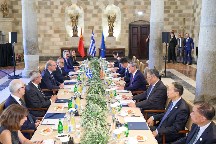 當(dāng)?shù)貢r(shí)間7月4日下午,國務(wù)院總理李強(qiáng)在希臘羅德島會(huì)見希臘副總理哈齊達(dá)基斯。新華社記者 劉彬 攝