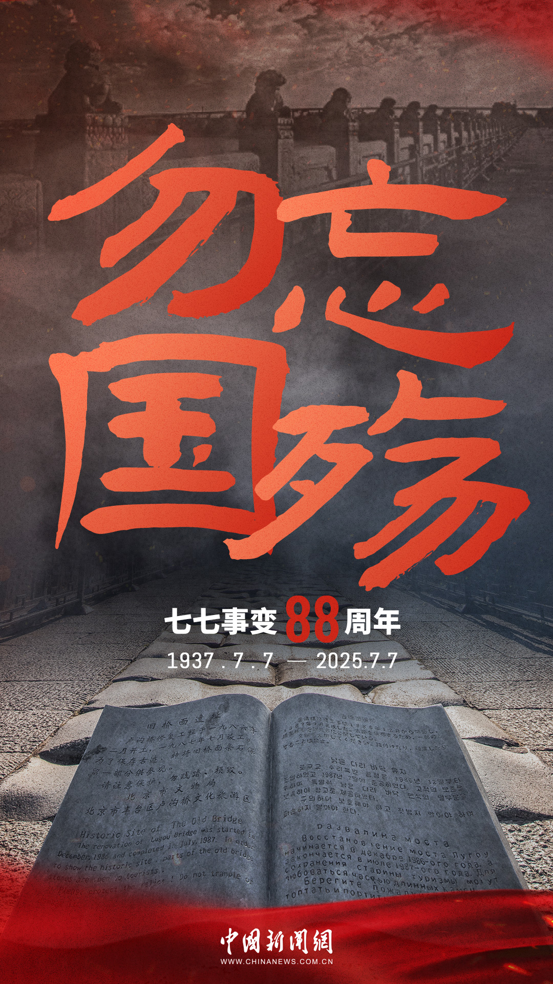 1937年7月7日,盧溝橋的槍聲撕裂長(zhǎng)夜,中華兒女赴湯蹈火,以血肉之軀筑起御敵長(zhǎng)城。88載歲月流轉(zhuǎn),硝煙雖散,彈痕猶在,那段浸透血淚的歷史,是刻在民族記憶里永不褪色的烙印。今日山河錦繡,國(guó)泰民安,正是先烈用生命換來(lái)的盛世。七七事變88周年,致敬英烈,銘記國(guó)殤,吾輩自強(qiáng),護(hù)山河無(wú)恙!