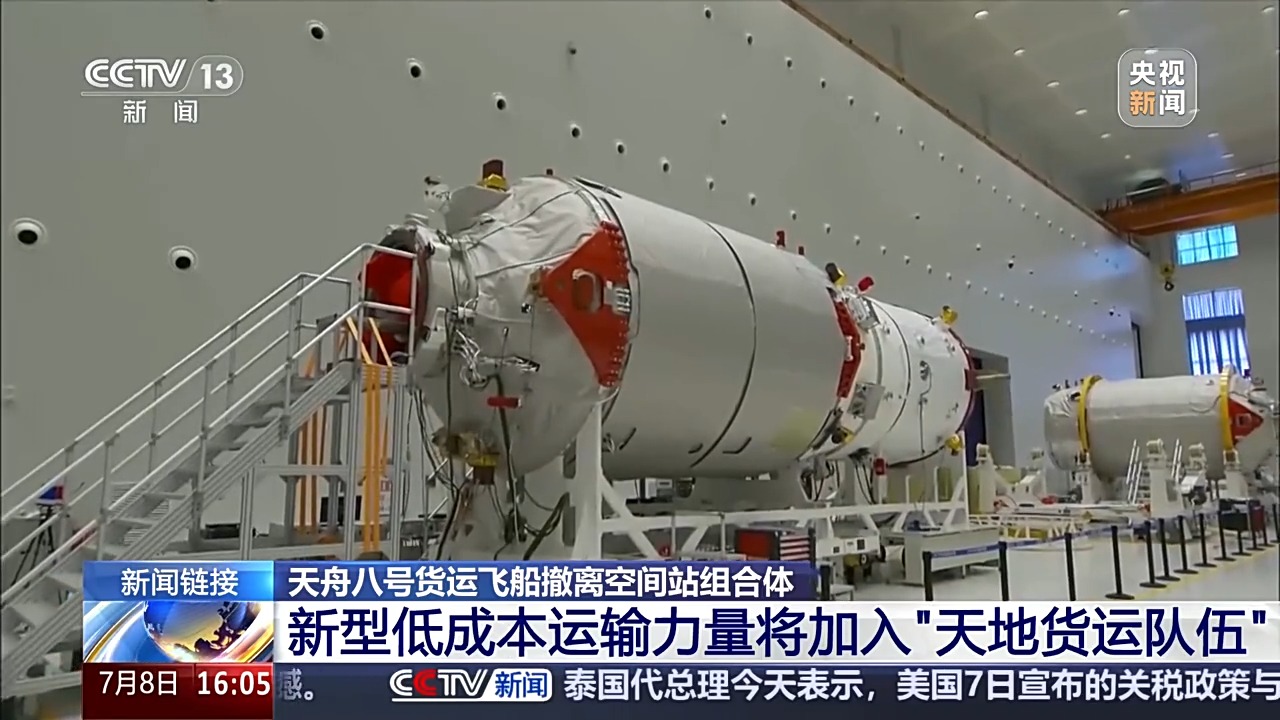 北京時(shí)間2025年7月8日15時(shí)9分,天舟八號(hào)貨運(yùn)飛船順利撤離空間站組合體,轉(zhuǎn)入獨(dú)立飛行階段,將于近期擇機(jī)受控再入大氣層。天舟八號(hào)貨運(yùn)飛船于2024年11月15日在文昌航天發(fā)射場發(fā)射入軌,共計(jì)在軌運(yùn)行近八個(gè)月,為神舟十九號(hào)、二十號(hào)乘組提供了物資保障。通過短片,一起回顧天舟八號(hào)的任務(wù)過程。
