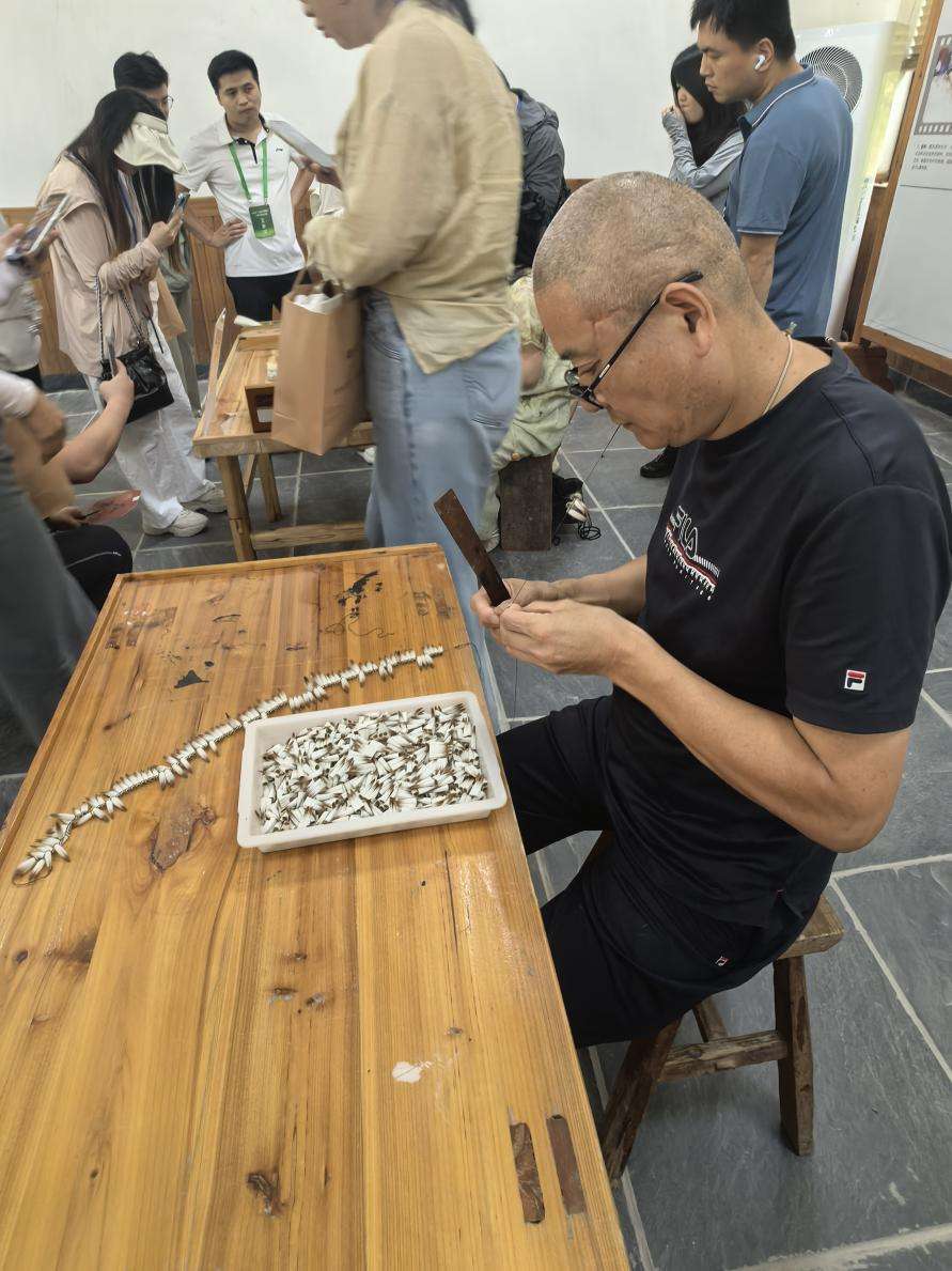 在博物館的體驗區(qū)域,幾位制筆匠人正現(xiàn)場演示毛筆制作的各工藝環(huán)節(jié)。市級非物質(zhì)文化遺產(chǎn)項目代表性傳承人周平正咬著線的一端,兩手飛快地纏綁筆頭,這是制筆過程的“綁筆”環(huán)節(jié)。周平的徒弟李啟富在一旁認真觀看,將師父的每一個動作記在心里。