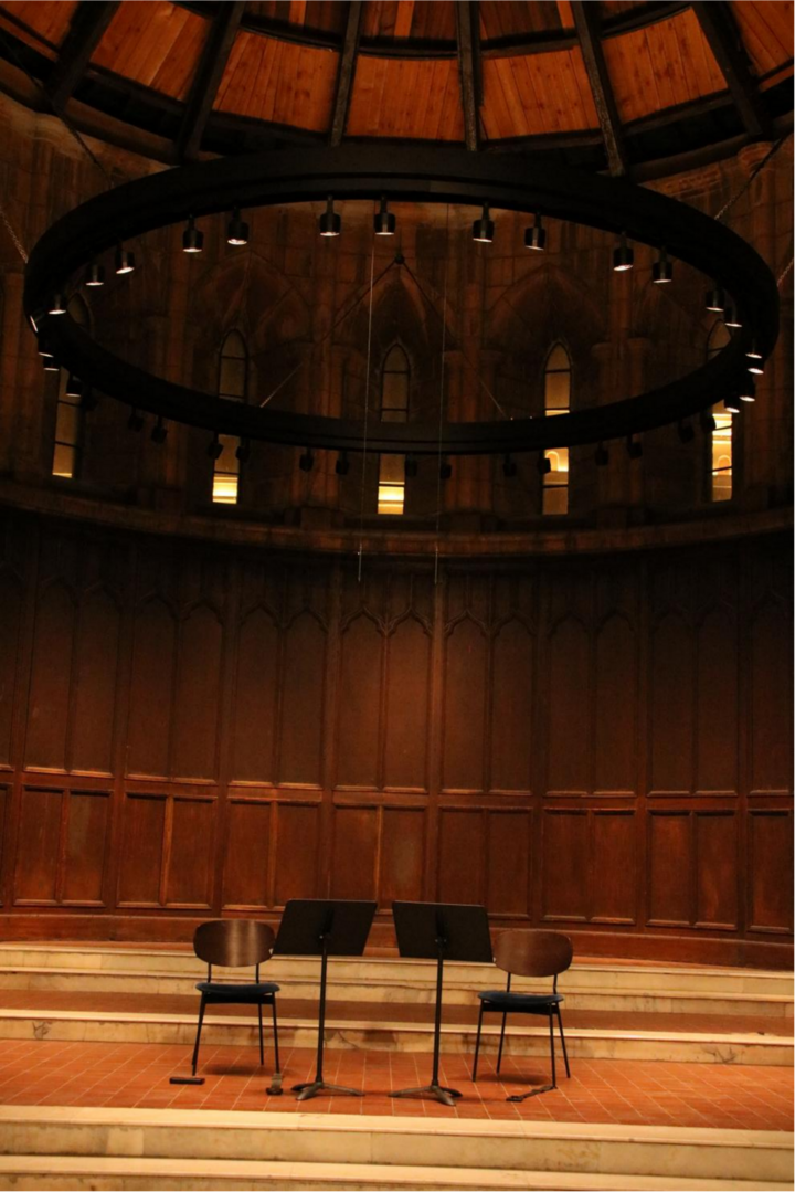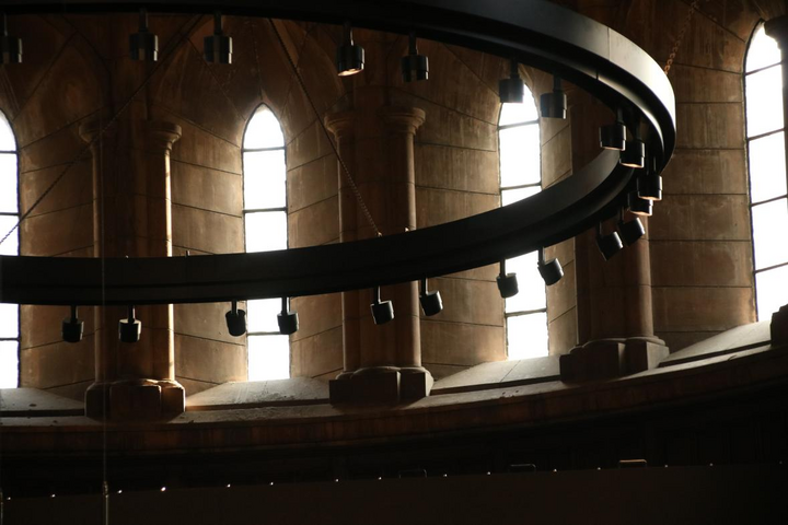 在原來祭臺(tái)的中間,現(xiàn)在改造為演講、演奏的環(huán)形中心臺(tái)。上方是一個(gè)中央環(huán)形燈,在沒亮燈之前就像一條烏黑色的緞帶,神秘且漂亮。
