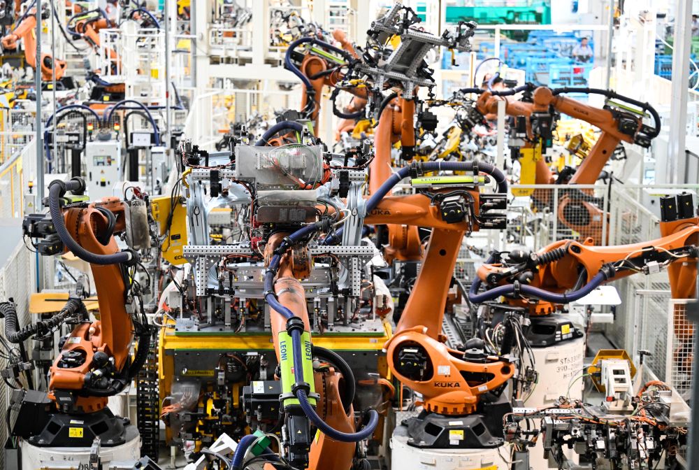 7月7日,機械臂等自動化生產(chǎn)設(shè)備在天津經(jīng)濟技術(shù)開發(fā)區(qū)一汽-大眾華北基地焊裝車間作業(yè)。新華社記者趙子碩 攝