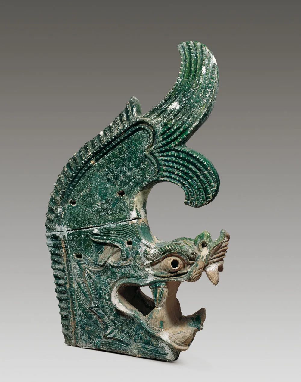 在中國(guó)國(guó)家博物館“古代中國(guó)”基本陳列上,一件出土于西夏陵6號(hào)陵的綠釉鴟吻十分顯眼。作為西夏陵的一個(gè)建筑構(gòu)件,它形體高大,既與同時(shí)期中原地區(qū)的鴟吻相似,又具有龍頭比例更大、魚尾分叉等方面的獨(dú)創(chuàng)性。
