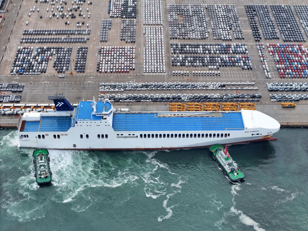 6月29日,汽車運(yùn)輸船??可綎|港口煙臺(tái)港,準(zhǔn)備裝運(yùn)出口汽車(無(wú)人機(jī)照片)。新華社發(fā)(唐克 攝)