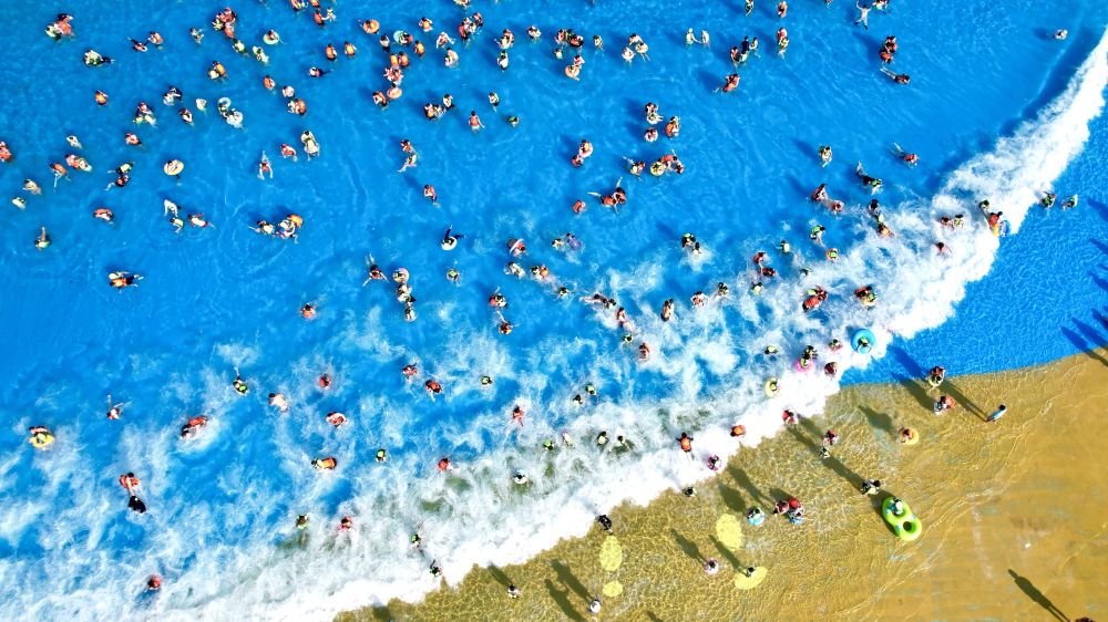 7月5日,浙江省湖州市長(zhǎng)興縣太湖圖影旅游度假區(qū)龍之夢(mèng)樂園嬉水世界,游客親水消暑(無人機(jī)照片)。新華社發(fā)(吳拯 攝)