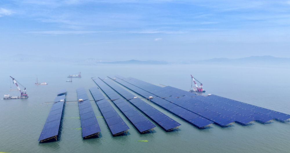 青島市即墨區(qū)鰲山灣海域的海上光伏項(xiàng)目區(qū)(7月3日攝,無人機(jī)照片)。新華社記者李紫恒攝