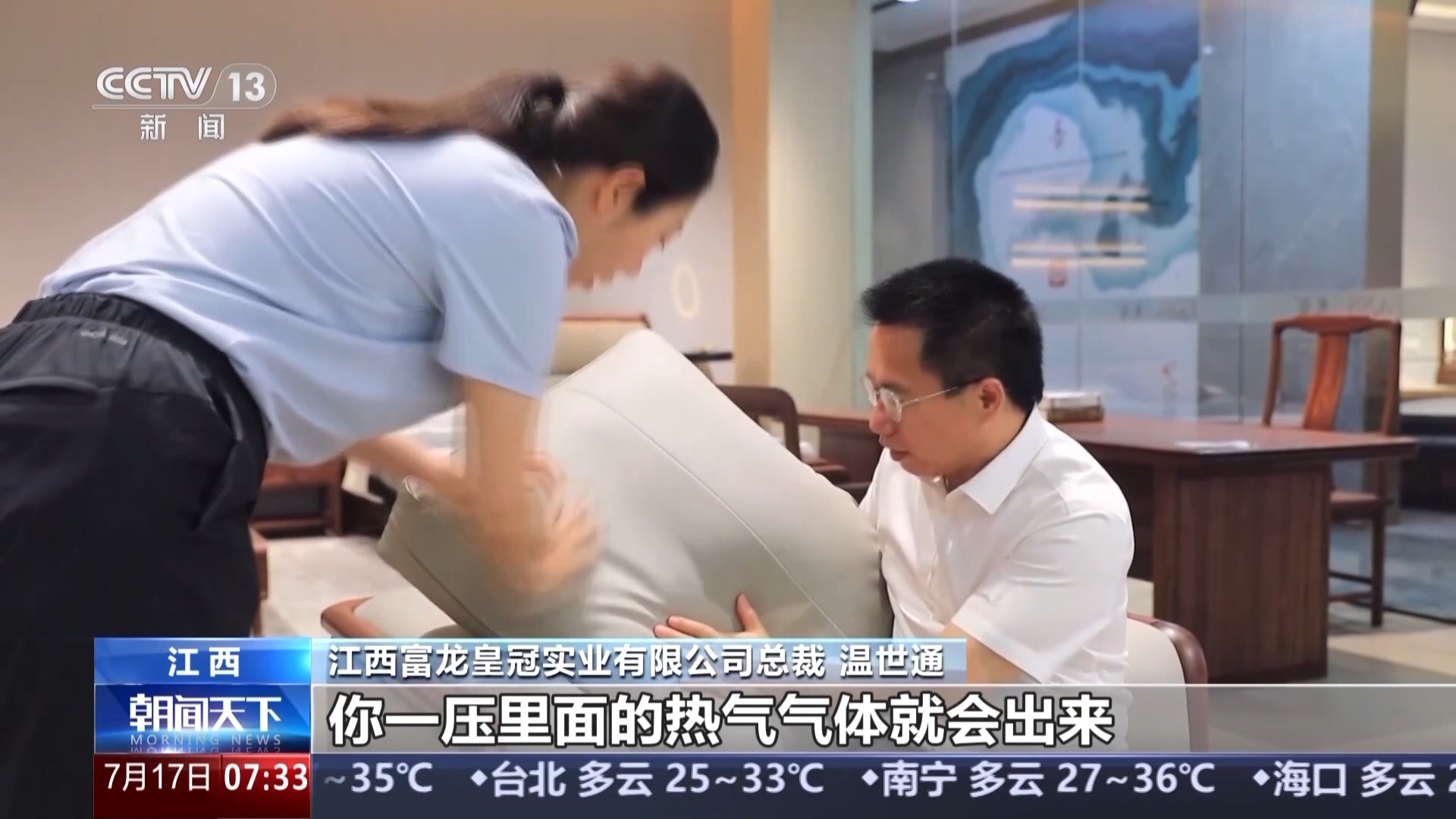 江西富龍皇冠實(shí)業(yè)有限公司總裁 溫世通:沙發(fā)靠墊后面我們?nèi)看蛄送笟饪祝粔豪锩娴臒釟鈿怏w就會(huì)出來,保證背部不會(huì)有很熱很燙的感覺,在銷售方面保持增長。