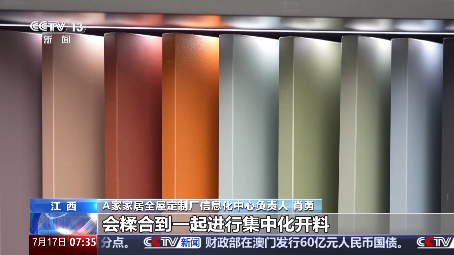 A家家居全屋定制廠信息化中心負(fù)責(zé)人 肖勇:相同顏色的數(shù)據(jù)會(huì)糅合到一起進(jìn)行集中化開料,最大效率提高整個(gè)板材的利用率,提效在93%。