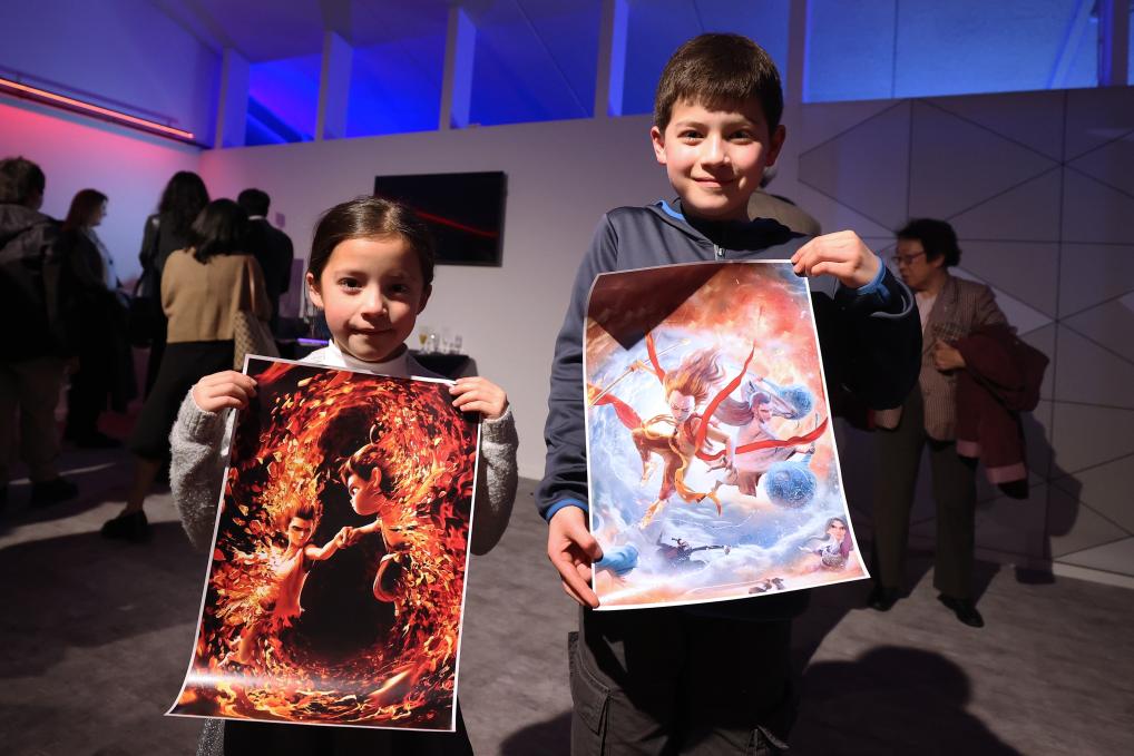 3月26日,在比利時(shí)布魯塞爾,小朋友在《哪吒之魔童鬧?!肥子郴顒?dòng)上手持海報(bào)合影。新華社記者趙丁喆攝