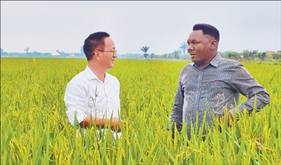 楊華德(左)在田間向當?shù)胤N植戶講解水稻種植技術(shù)。本報記者 黃培昭攝