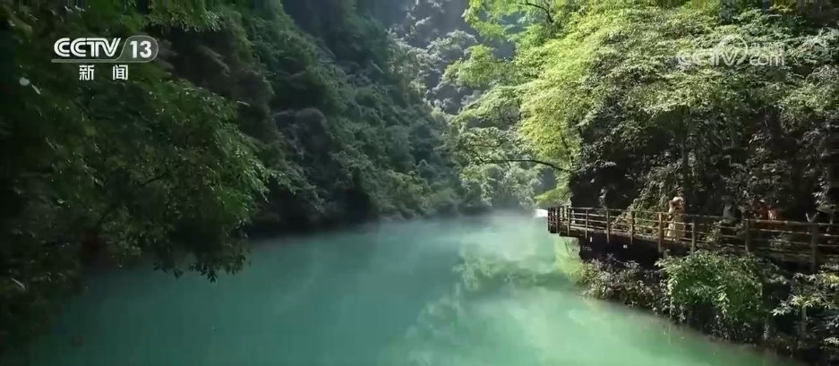 在大峽谷谷底,形態(tài)各異的峰林與緩緩流淌的溪水構(gòu)成了天然畫(huà)卷,陣陣微涼的山風(fēng)吹來(lái),游客們仿佛漫步在原始森林中,在喧囂的夏天中感受到了一份難得的靜謐和涼爽。