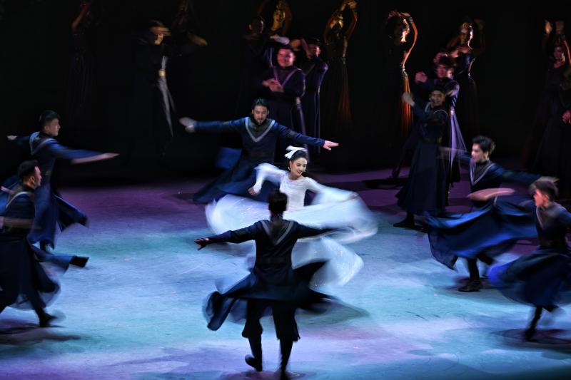 新疆木卡姆藝術集歌、舞、樂于一體。這部舞劇高潮時刻,盛大的婚禮歌頌著愛情,彈撥爾、熱瓦普等樂器依次奏響,刀郎木卡姆、哈密木卡姆等輪番上演。演員舞姿或剛勁有力,或熱鬧歡愉,帶領觀眾進入歡樂的海洋。