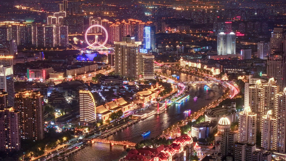 夜幕降臨,海河兩岸璀璨絢麗、千變?nèi)f化:高層建筑披上燈光外衣,勾勒出兩岸高低協(xié)調(diào)、錯(cuò)落有致的天際線;跨越在海河兩岸的座座橋梁,如長虹臥波、玉帶蜿蜒;游人排隊(duì)乘坐永樂橋“天津之眼”摩天輪,座艙升至最高處,可將大半座城市的繁華盡收眼底……