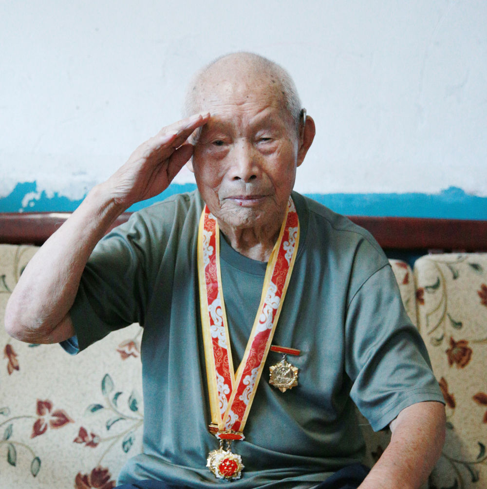7月24日,96歲的抗日老兵臧海龍?jiān)诩抑姓故拒姸Y。新華社記者 肖磊濤 攝