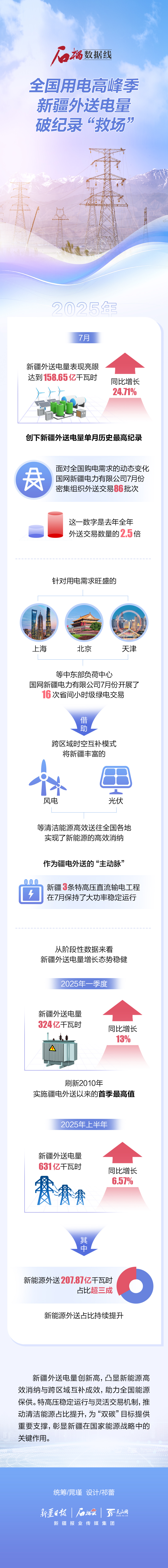 7月新疆外送電量表現(xiàn)亮眼,達(dá)到158.65億千瓦時(shí),同比增長(zhǎng)24.71%,創(chuàng)下新疆外送電量單月歷史最高紀(jì)錄。
