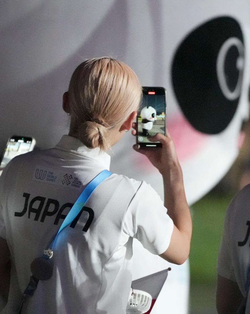 2025年8月7日,一名日本體育代表團成員在開幕式上拍攝吉祥物“蜀寶”。當(dāng)日,第12屆世界運動會開幕式在成都舉行。新華社記者 胥冰潔 攝