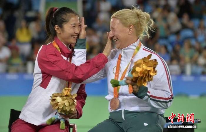 2016年9月14日,里約殘奧會(huì),輪椅擊劍女子個(gè)人花劍A級(jí)比賽冠軍獲得者中國(guó)選手榮靜正與獲得銅牌的匈牙利選手克拉伊尼亞克相互擦拭喜悅的淚水?!∷_樂(lè)馬什 攝