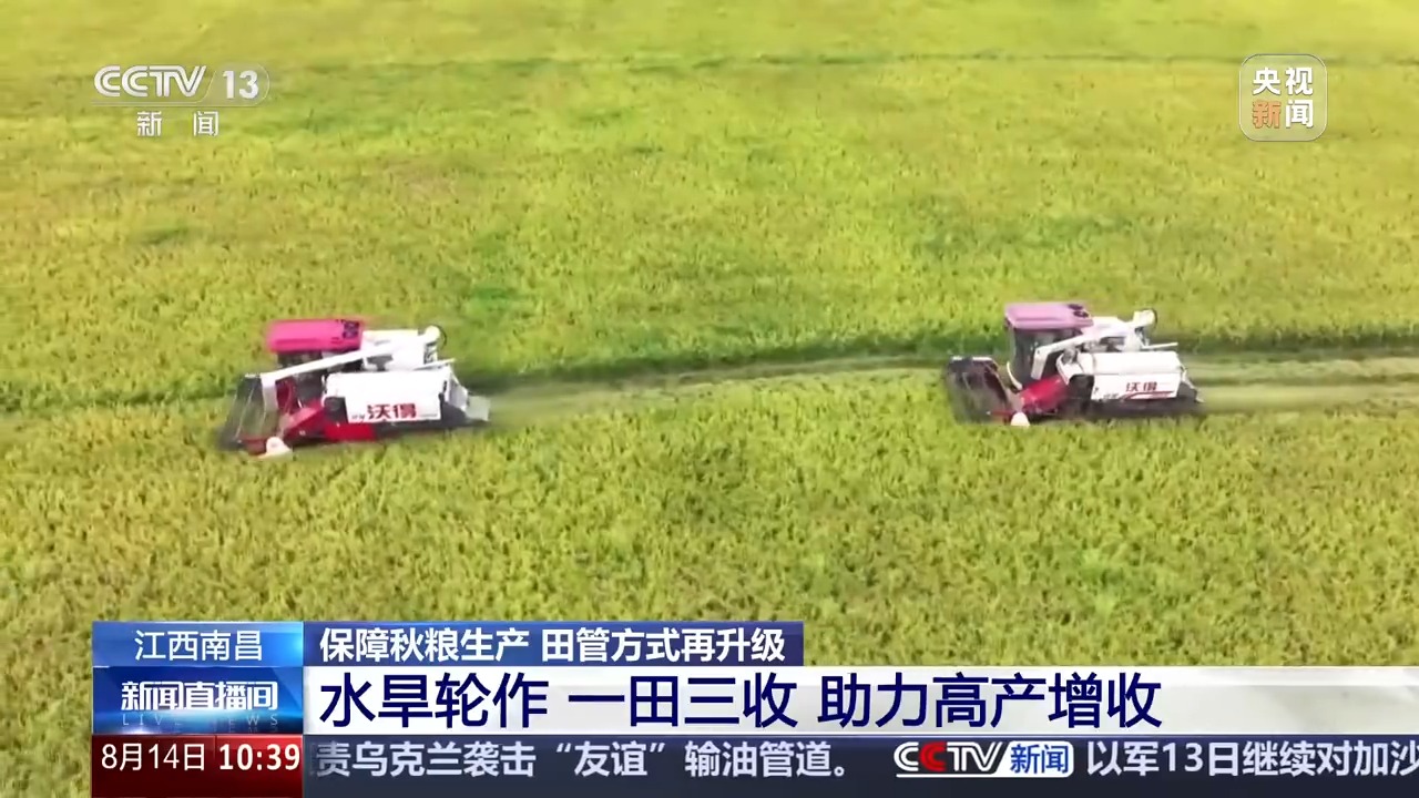 在江西南昌聯(lián)圩鎮(zhèn),一茬茬飽滿的稻穗被迅速收割、脫粒,裝入運輸車輛。而在收割機作業(yè)的田塊旁,翻耕起壟機正加緊作業(yè),農(nóng)戶們忙著清溝除雜、整理田地,為播種優(yōu)質高產(chǎn)大豆做足準備。今年當?shù)夭捎?strong>水旱輪作、一田三收的種植方式,春季種水稻,初秋收完水稻后搶種大豆,秋末大豆收獲后緊接著種植耐寒蔬菜或油菜,三季作物茬口緊密銜接,全年無閑田。同時,通過推廣良種、測土配方施肥等技術,確保每種作物都能優(yōu)質高產(chǎn)。