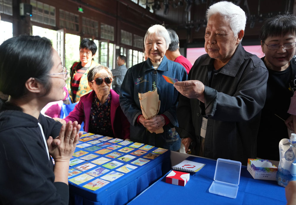 2024年10月11日,在杭州市西湖區(qū)北山街道舉行的情暖桑榆——孝親敬老服務(wù)進(jìn)社區(qū)活動(dòng)中,志愿者面向社區(qū)居民開展心理健康服務(wù)。新華社記者 韓傳號(hào) 攝