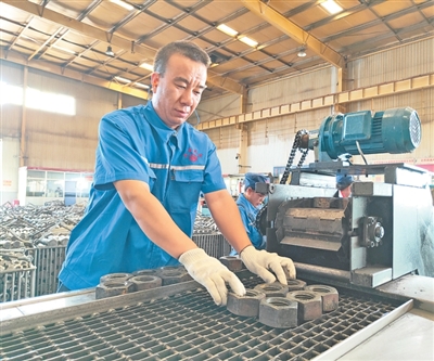 圖為邢亞軍在檢查螺母質(zhì)量。