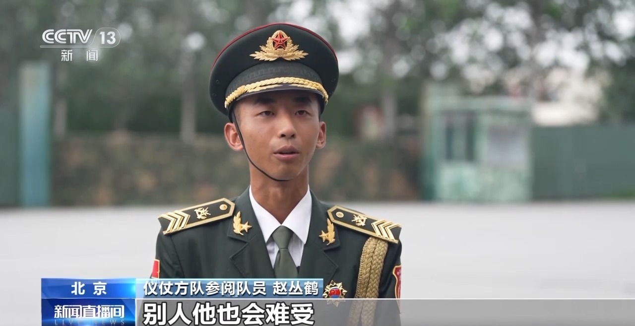 儀仗方隊受閱隊員 趙叢鶴:其實當你難受的時候,別人他也會難受,像這個時候我們比拼的就不是身體素質(zhì)了,我們比拼的是意志力。