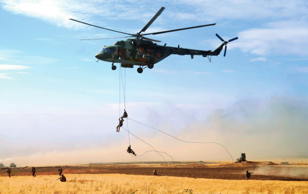 在俄羅斯奧倫堡州東古茲靶場舉行的“和平使命-2021”上海合作組織聯(lián)合反恐軍事演習(xí)實兵實彈演習(xí)中,多國聯(lián)合部隊特戰(zhàn)分隊執(zhí)行索降作戰(zhàn)任務(wù)(資料照片)梅世雄攝 / 本刊