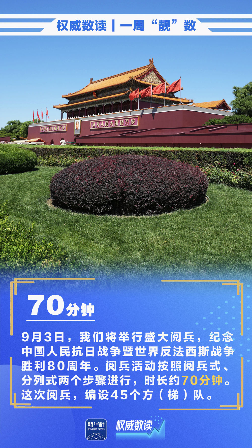 即將到來的九三閱兵活動按照閱兵式、分列式兩個(gè)步驟進(jìn)行,時(shí)長約70分鐘;我國外貿(mào)保持穩(wěn)中有進(jìn)態(tài)勢,累計(jì)進(jìn)出口增速逐月回升,前7個(gè)月實(shí)現(xiàn)3.5%的增長;今年前7個(gè)月,我國對上海合作組織其他成員國進(jìn)出口2.11萬億元,規(guī)模創(chuàng)歷史同期新高……本周這些數(shù)據(jù),最值得關(guān)注!