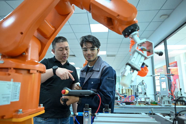 在天津現(xiàn)代職業(yè)技術(shù)學(xué)院魯班工坊實(shí)訓(xùn)教室,教師指導(dǎo)學(xué)生操作設(shè)備(2025年6月16日攝)。