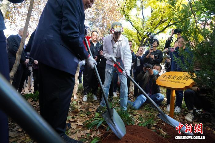 2023年11月3日,美國(guó)飛虎隊(duì)老兵哈里·莫耶在昆明與中方代表共植友誼樹。中新社記者 劉冉陽 攝