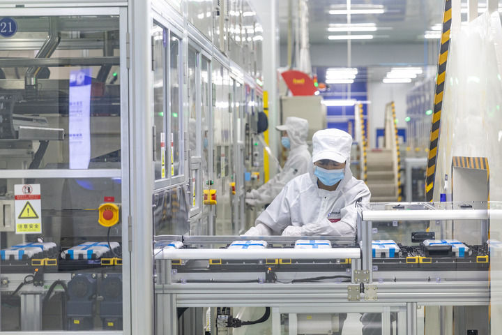 2024年9月27日,在位于重慶市銅梁區(qū)的海辰儲能重慶制造基地,工作人員在生產(chǎn)線上初步檢測兩個電芯是否配對。
