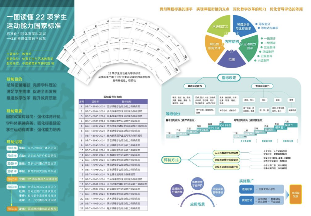 標(biāo)準(zhǔn)研制牽頭人、中國教育科學(xué)研究院體育美育教育研究所所長于素梅介紹:“這套國家標(biāo)準(zhǔn)包含足球、籃球等21項(xiàng)專項(xiàng)運(yùn)動(dòng)能力和1項(xiàng)基本運(yùn)動(dòng)能力,每項(xiàng)標(biāo)準(zhǔn)都劃分六個(gè)等級且逐級提升?;具\(yùn)動(dòng)能力六個(gè)等級與學(xué)段年級對應(yīng),專項(xiàng)運(yùn)動(dòng)能力六個(gè)等級按難度進(jìn)階劃分為三期。”