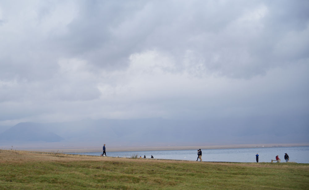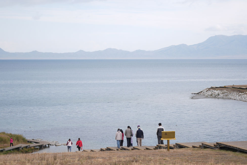 ↑ 9月10日,游客在賽里木湖畔游玩。