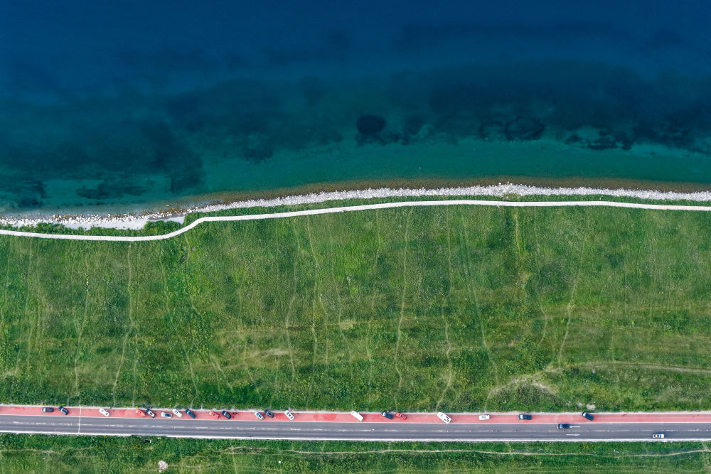 ↑ 游客駕車行駛在賽里木湖景區(qū)(無人機(jī)照片,7月8日攝)。