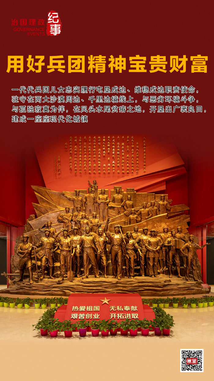 ◇2022年7月,習(xí)近平總書記在新疆考察時來到新疆生產(chǎn)建設(shè)兵團(tuán)八師石河子市,參觀新疆兵團(tuán)軍墾博物館。會見兵團(tuán)老中青三代建設(shè)者代表時,他強(qiáng)調(diào),新疆生產(chǎn)建設(shè)兵團(tuán)為推動新疆發(fā)展、增進(jìn)民族團(tuán)結(jié)、維護(hù)社會穩(wěn)定、鞏固國家邊防作出了不可磨滅的貢獻(xiàn)。兵團(tuán)人鑄就的熱愛祖國、無私奉獻(xiàn)、艱苦創(chuàng)業(yè)、開拓進(jìn)取的兵團(tuán)精神,是中國共產(chǎn)黨人精神譜系的重要組成部分,要用好這些寶貴財(cái)富。