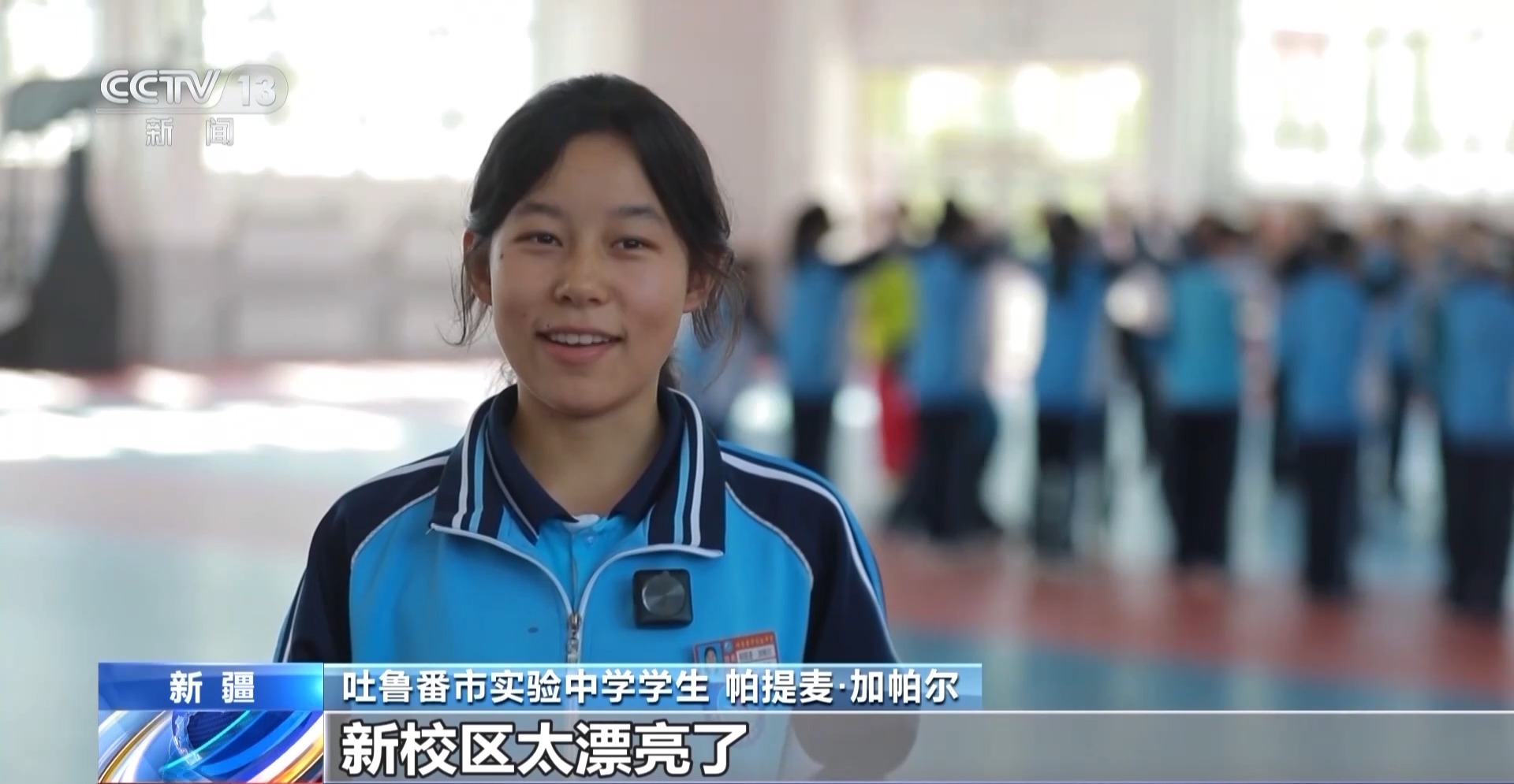 吐魯番市實驗中學學生 帕提麥·加帕爾:新校區(qū)太漂亮了,在這里我現(xiàn)在學習勁頭兒十足,已經(jīng)愛上這里的生活了。