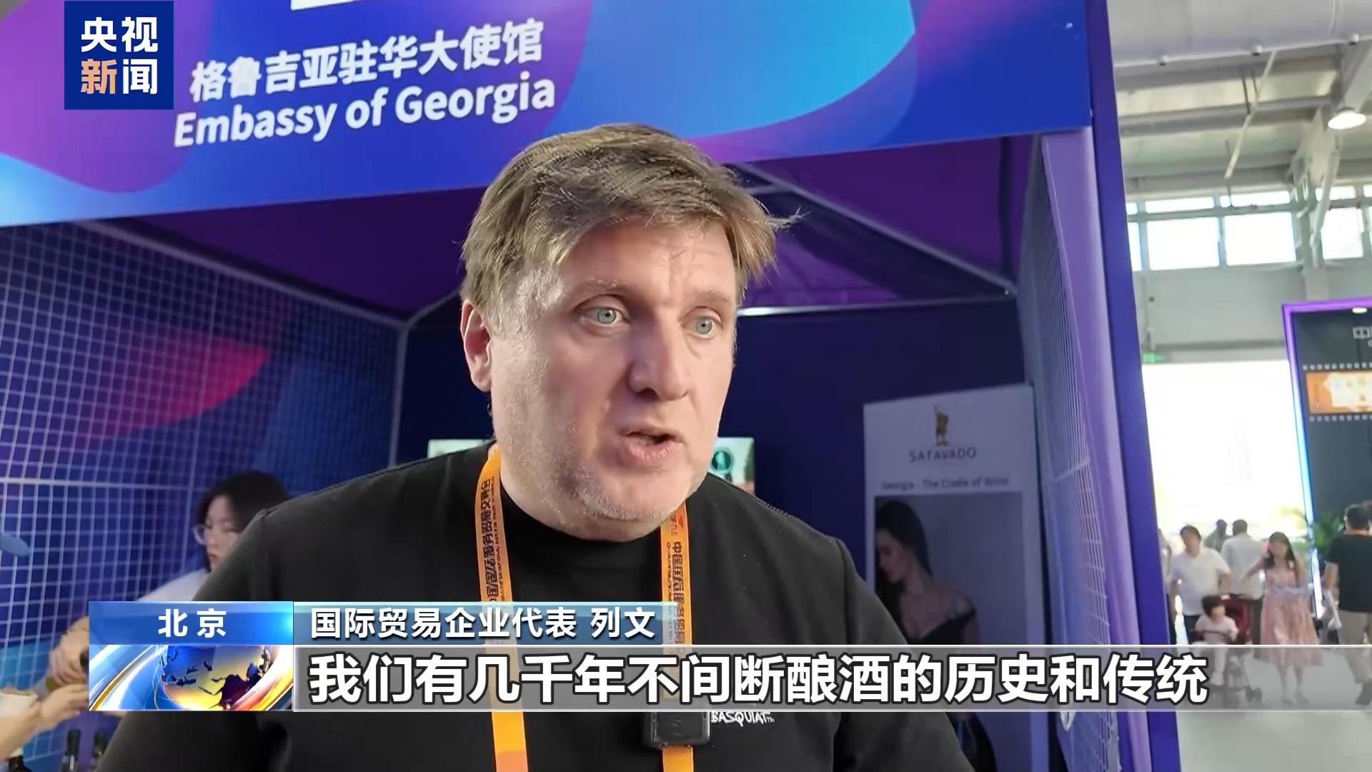 在格魯吉亞駐華大使館展臺(tái),國(guó)際貿(mào)易企業(yè)代表列文正在請(qǐng)觀眾品嘗格魯吉亞的特色葡萄酒。他說(shuō),他的公司已經(jīng)連續(xù)7年參加服貿(mào)會(huì)。