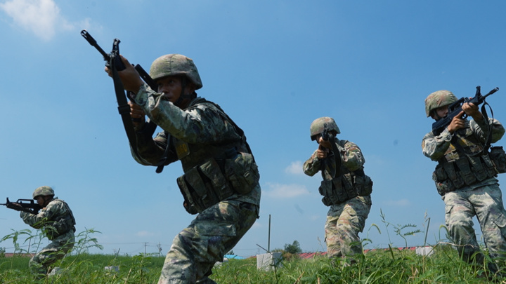 烈日灼人,汗水混雜著泥土粘在作訓服上。但戰(zhàn)士們一絲不茍,目光如炬,動作凌厲,搜索、突擊、越障、匍匐……一舉一動彰顯著人民軍隊的凜然軍威與中國軍人的過硬本領。?
