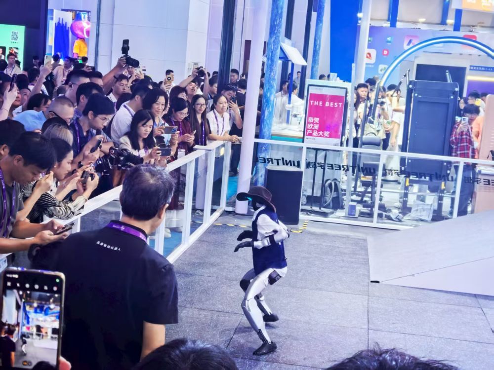 在東博會(huì)宇樹(shù)科技展位,機(jī)器人在表演熱舞。新華社記者王楚然 攝