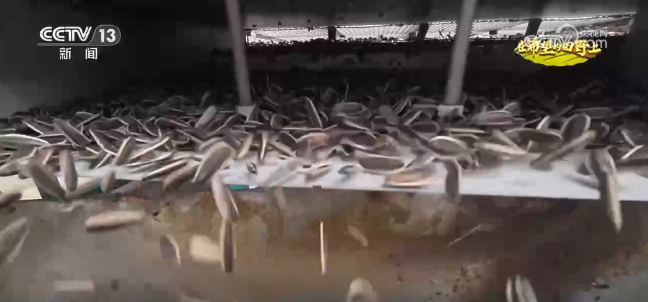 這種節(jié)奏感十足的采收方式與向日葵獨(dú)特的生長方式有關(guān),成熟的向日葵花盤低垂,采收時需要“第一砍”先將花盤砍下,“第二砍”再將株稈砍短,“第三插”把向日葵花盤向上插進(jìn)株稈。經(jīng)過幾天的充分晾曬后,花盤水分減少,籽粒更加緊實(shí),這時再收進(jìn)脫粒機(jī)完成脫粒作業(yè),經(jīng)過清選、去雜后發(fā)往加工廠。
