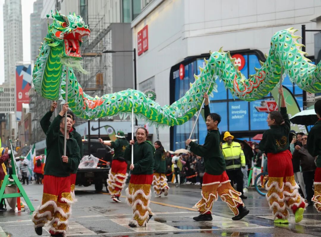 當(dāng)?shù)貢r(shí)間2025年3月16日,加拿大多倫多,在慶祝愛(ài)爾蘭民族傳統(tǒng)節(jié)日圣帕特里克節(jié)(St. Patrick’s Day)的大游行中,一支中式舞龍隊(duì)舞動(dòng)綠色長(zhǎng)龍。中新社記者 余瑞冬 攝