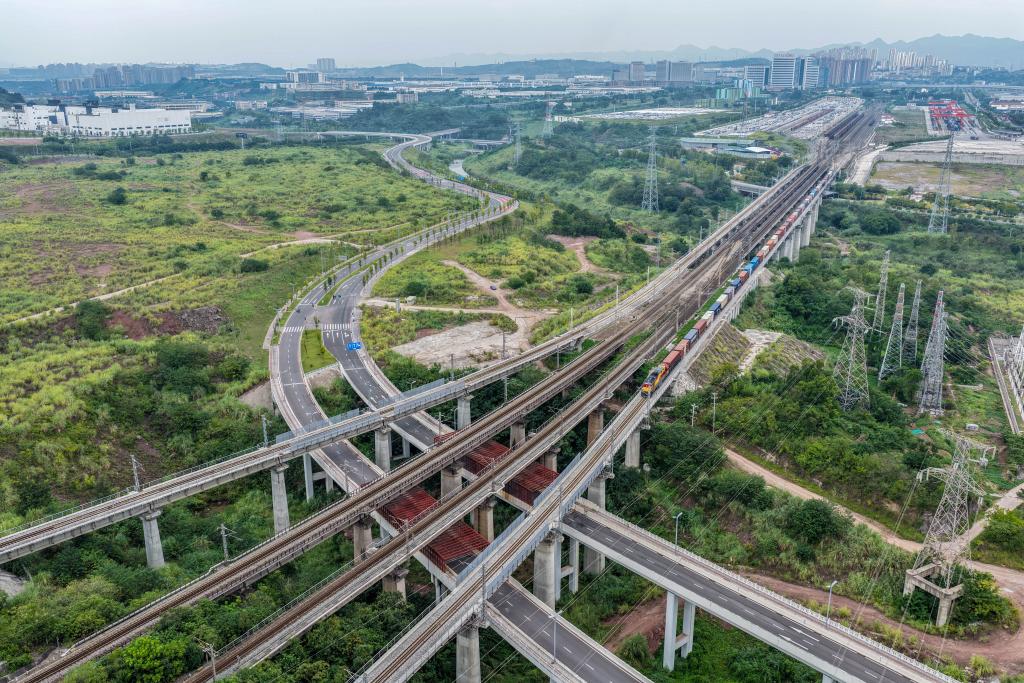9月28日,西部陸海新通道班列在重慶魚嘴站順利發(fā)車(無人機照片)新華社記者 唐奕 攝