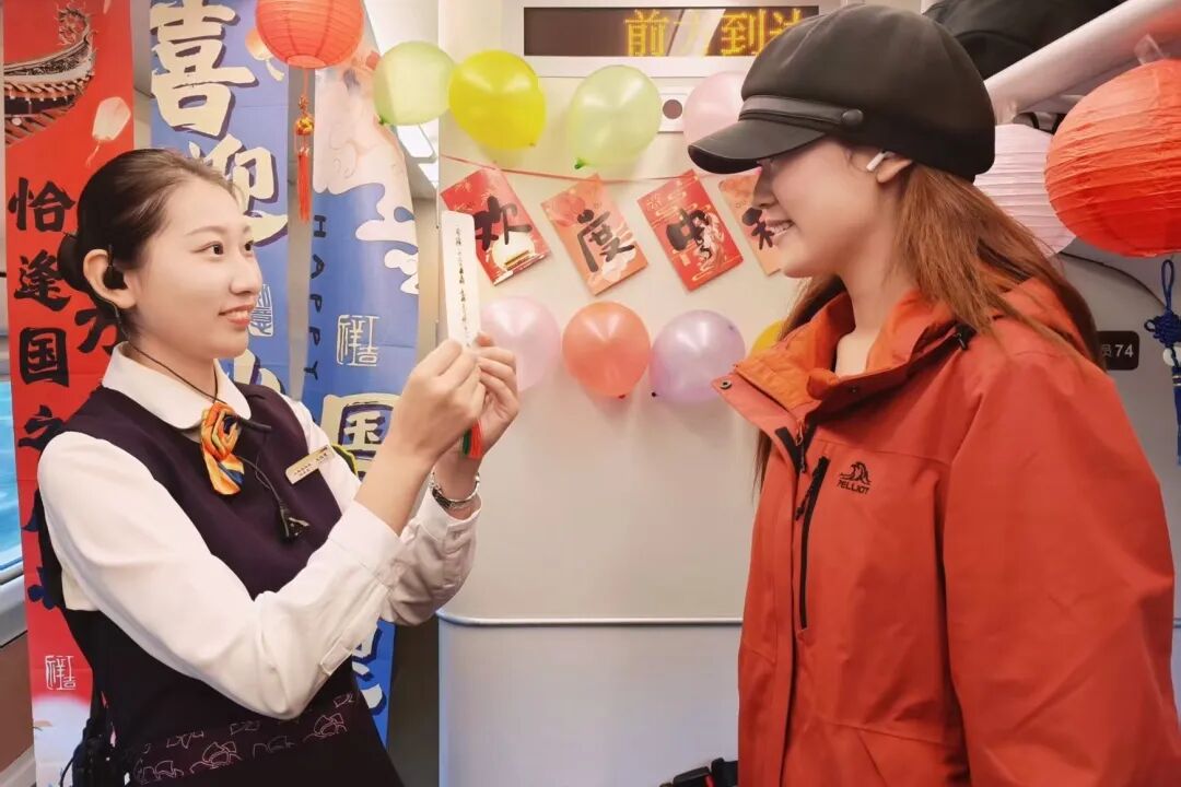 車廂內(nèi),懸掛的燈籠點(diǎn)綴出濃濃節(jié)日氣息。青年職工演唱歌曲《看月亮爬上來(lái)》,熟悉的旋律引發(fā)旅客共鳴;“舉頭望明月(打一中藥名)”等趣味猜燈謎活動(dòng),吸引不少旅客踴躍參與;身著漢服的乘務(wù)員帶領(lǐng)孩子們玩起傳統(tǒng)套圈游戲,月餅、玩偶作獎(jiǎng)品,歡聲笑語(yǔ)不斷。